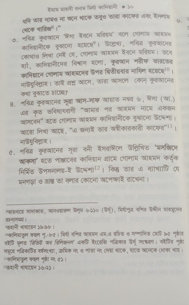 (৩) ঈসা (আ.)-কে কুরআন দ্বারা জীবিত প্রমাণ করতে বলছেন। আরে ভাই, মির্যা গোলাম আহমদ ইবনে চেরাগবিবি তো নিজেই ১৮৮৪ সালে তার ‘বারাহীনে আহমদীয়া’ (৪র্থ খন্ড) গ্রন্থে পবিত্র কুরআনের সূরা তওবাহ, আয়াত নম্বর ৩৩ (هُوَ الَّذِي أَرْسَلَ رَسُولَهُ بِالْهُدَىٰ وَدِينِ الْحَقِّ لِيُظْهِرَهُ عَلَى الدِّينِ كُلِّهِ وَلَوْ كَرِهَ الْمُشْرِكُونَ) দ্বারা দলীল দিয়ে লিখে গেছে যে, এই আয়াতে ইংগিতে একখানা ভবিষ্যৎবাণী রয়েছে যে, মসীহ (ঈসা) এই পৃথিবীতে সশরীরে (جسمانى) এবং রাজনৈতিক দর্পনেই (سياست ملكى) পুনরায় আসবেন।