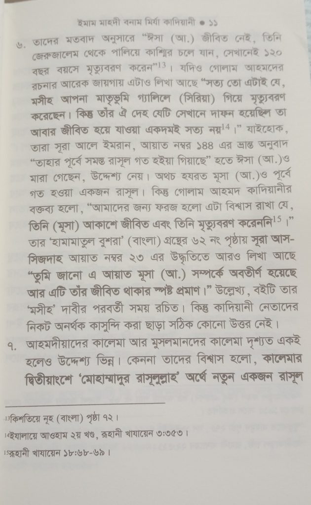 মজার ব্যাপার হচ্ছে, আপনি যার চোখ দিয়ে ইসলাম দেখছেন এবং যার শিক্ষামতে পবিত্র কুরআনের নামে ঈসা (আ.)-কে মেরে ফেলতে বসে আছেন, সেই গোলাম আহমদ কাদিয়ানী নিজেই তার আরেকটি রচনায় লিখে গেছে,