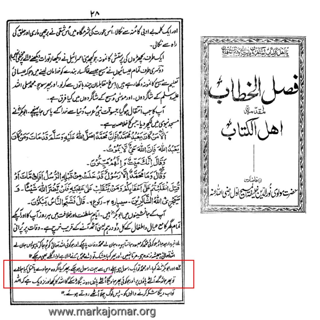 অর্থাৎ “আর যেমনিভাবে আল্লাহ তাআলা তাঁকে বলে দিয়েছেন যে, কাশ্মীরের শ্রীনগরের খানইয়ার মহল্লায় তাঁর (মসীহ ঈসা) কবর বিদ্যমান।” রেফারেন্স, আছলে মুছাফফা খন্ড ২ পৃষ্ঠা ২, রচনাকাল ১৯০১ ইং কাদিয়ান।