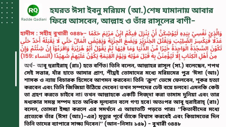 • উল্লেখ্য, ঈসা ইবনু মরিয়ম (আ.) আল্লাহর একজন বান্দা ও রাসূল ছিলেন, আল্লাহ তাঁকে আকাশে উঠিয়ে নিয়েছেন, কেয়ামতের পূর্বে তিনি আকাশ থেকে দামেস্কে অবতরণ করবেন। এ সম্পর্কিত অথেনটিক তথ্যপ্রমাণ দেখতে এখানে Click করুন।