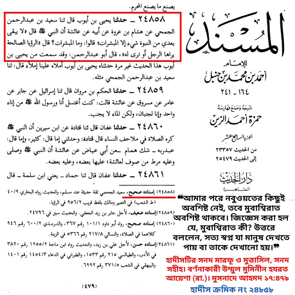 আমি অথেনটিক বর্ণনাগুলো থেকে মাত্র কয়েকটি সম্পূর্ণ বর্ণনা আপনার সামনে তুলে ধরছি, মেহেরবানী করে আমাকে গোলাম আহমদের সাথে মিলিয়ে দেখাবেন। তবে কোনো মনগড়া ব্যাখ্যা দিতে পারবেন না। ব্যাখ্যা যদি দিতেই হয় তাহলে অন্তত গোলাম আহমদ কাদিয়ানীর জন্মেরও পূর্বেকার মাননীয় যুগ ইমামগণ থেকে (ব্যাখ্যা) দিতে হবে।