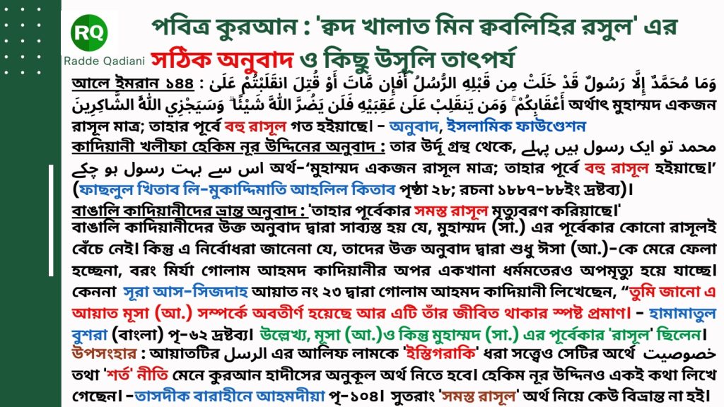২। কাদিয়ানীদের দাওয়াতি কর্মপন্থা কী? তারা সাধারণ মানুষকে কেমন বয়ান দ্বারা বুঝায় বা দাওয়াত দেয়? আপনারা কি সে বয়ানগুলো নোট করেছেন? সেসব বয়ানের বিপরীতে আপনারা কি আরও শক্তিশালী কোনো বয়ান তৈরি করতে পেরেছেন? আপনারা কি সেই শক্তিশালী বয়ানের উপর তারবিয়ত তথা প্রশিক্ষণ কর্মশালার ব্যবস্থা করেছেন? কিছু দাঈ তৈরি করে আক্রান্ত এলাকাগুলোয় দাওয়াতি কাজের কোনো উদ্যোগ নিতে পেরেছেন?