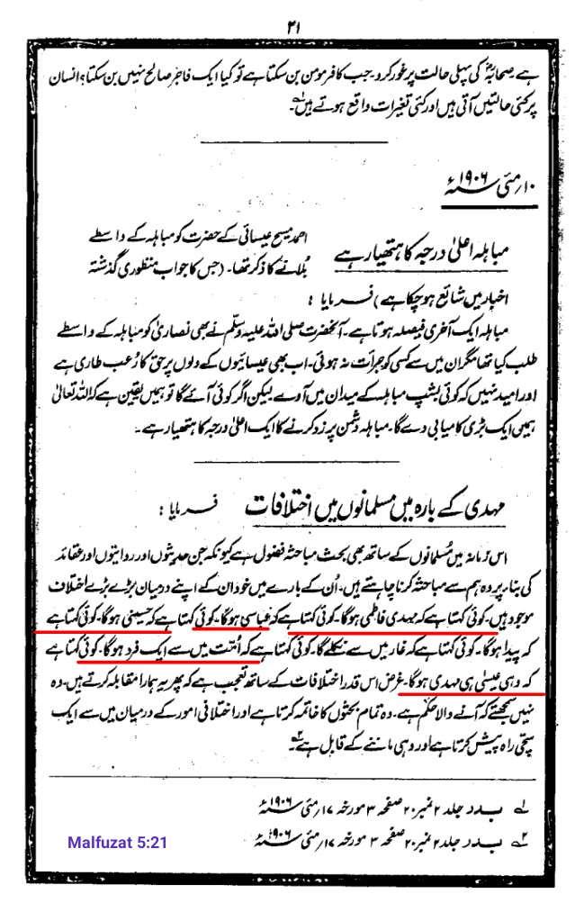 মির্যা কাদিয়ানীর ৫ খণ্ডে প্রকাশিত “মালফুযাত” গ্রন্থের ৫ নং খন্ডের ২১ নং পৃষ্ঠাটি দেখলেই বুঝা যাবে যে, সে সাধারণ মানুষকে বিভ্রান্ত করতে কিভাবে হটকারিতার আশ্রয় নিয়েছিল। প্রামাণ্য স্ক্যানকপি নিম্নরূপ। আজকের এ লিখাটিতে ইমাম মাহদীর পরিচয় সম্পর্কে তার বিভ্রান্তিকর লিখনীর খণ্ডনমূলক উত্তর দেয়া হবে।