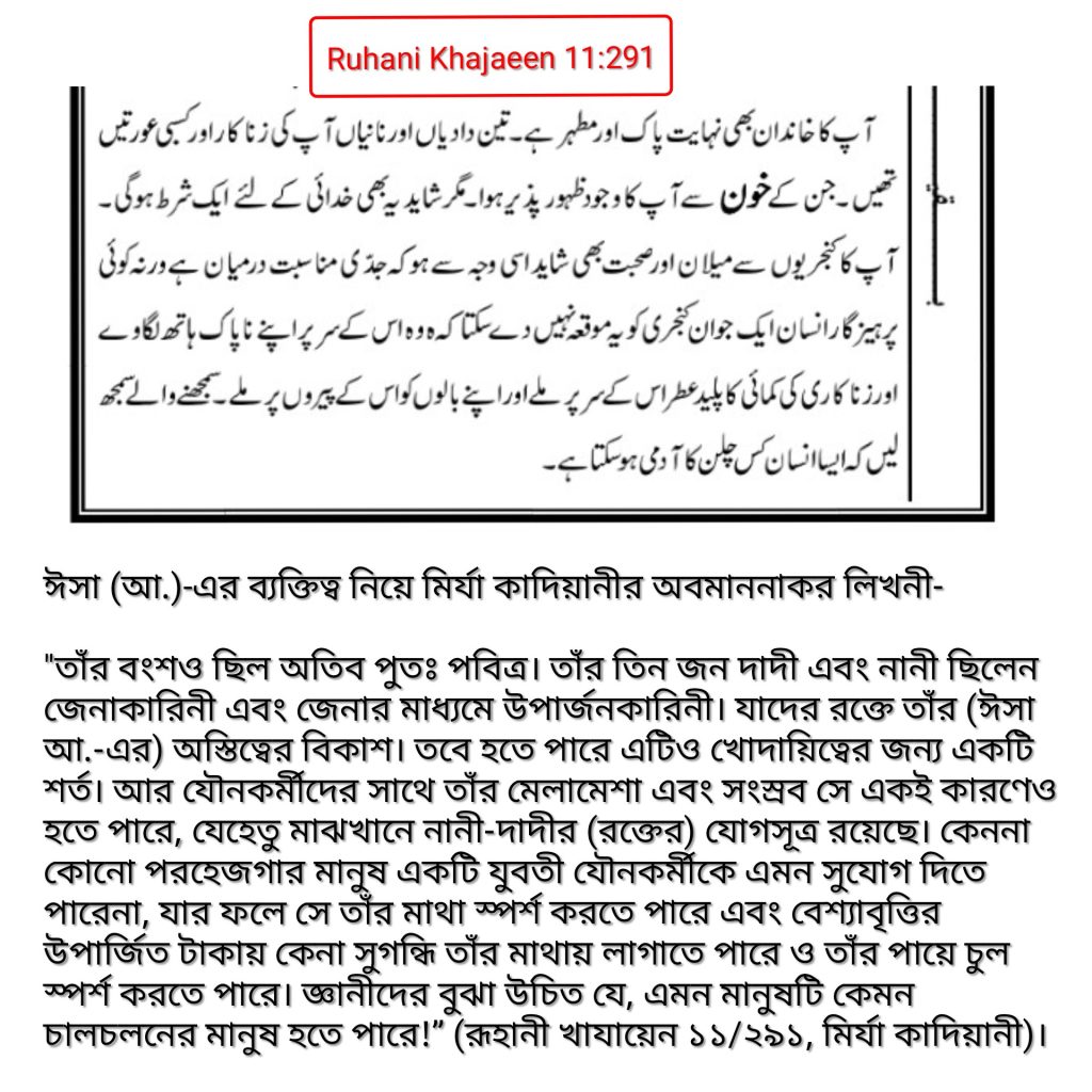 (সাত) মির্যা কাদিয়ানীর বইয়ের অন্য আরেক জায়গায় ঈসা (আ.) সম্পর্কে লিখা আছে, ‘তাঁর এইরকম আচার-আচরণ দ্বারা নিজ সহোদর ভাইও তাঁঁর (ঈসা) প্রতি ভীষণ অসন্তুষ্ট ছিলেন। তার বিশ্বাস ছিল যে, তাঁর (ঈসা) মস্তিষ্কে নিশ্চয়ই কোনো সমস্যা রয়েছে। আর তিনি চাইতেন যেন কোনো দাওয়াখানায় (হাসপাতালে) তাঁঁর নিয়মিত চিকিৎসা চলে যাতে খোদাতালা তাঁকে আরোগ্য দান করেন।” (রূহানী খাযায়েন ১১/২৯০)। স্ক্রিনশট এই যে,