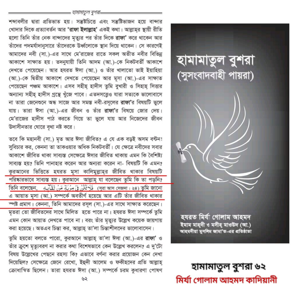 যেমন পবিত্র কুরআনে এসেছে, বিবি মরিয়মের উদ্দেশ্যে জিবরাঈল (আ.) বলেছিলেন (قَالَ إِنَّمَا أَنَا رَسُولُ رَبِّكِ لِأَهَبَ لَكِ غُلَامًا زَكِيًّا) ‘ক্বা-লা ইন্নামা আনা রাসূলু রাব্বিকি লিআহাবা লাকি গুলা-মান ঝাকিইইয়া’ অর্থাৎ সে বলল আমি তো কেবল তোমার রবের একজন রাসূল (তথা বার্তাবাহক), তোমাকে একজন পবিত্র পুত্র সন্তান দান করার জন্য এসেছি। (মরিয়াম/১৯:১৯); তাফসীরে কুরতুবীতে এসেছে, সূরা আল হাক্কাহ আয়াত নং ৪০ (إِنَّهُ لَقَوْلُ رَسُولٍ كَرِيمٍ) অর্থাৎ “নিশ্চয়ই এই কুরআন একজন সম্মানিত রাসূলের বার্তা”-এর তাফসীরে ইমাম হাসান বছরী, কলবী এবং মুক্বাতিল প্রমুখের মতে ‘রাসূল‘ শব্দ হতে হযরত জিবরাঈল (আ.) উদ্দেশ্য। এমনকি বহু সংখ্যক ফেরেশতাও এমন রয়েছেন যাদেরকে আল্লাহতালা পবিত্র কুরআনে ‘রাসূল‘ হিসেবে আখ্যা দিয়েছেন। যেমন সূরা হাজ্জ্ব এর ৭৫ নং আয়াতে এসেছে – (اللَّهُ يَصْطَفِي مِنَ الْمَلَائِكَةِ رُسُلًا وَمِنَ النَّاسِ ۚ إِنَّ اللَّهَ سَمِيعٌ بَصِيرٌ) অর্থাৎ ‘আল্লাহতালা ফেরেশতাদের মধ্য থেকে রাসূল মনোনীত করেন এবং মানুষের মধ্য থেকেও। নিশ্চয়ই আল্লাহ সর্বশ্রোতা ও সর্বদ্রষ্টা।’ আবার অপরদিকে মির্যা গোলাম আহমদ কাদিয়ানী লিখেছেন, সূরা আস-সিজদাহ আয়াত নং ২৩ (وَلَقَدْ آتَيْنَا مُوسَى الْكِتَابَ فَلَا تَكُن فِي مِرْيَةٍ مِّن لِّقَائِهِ ۖ وَجَعَلْنَاهُ هُدًى لِّبَنِي إِسْرَائِيلَ) অর্থাৎ ‘আমি তো মূসাকে গ্রন্থ দিয়েছিলাম, অতএব তুমি তার সাক্ষাৎ বিষয়ে সন্দেহ করো না। আমি একে (তাওরাত) বনী ইসরাঈলের জন্য পথনির্দেশক করেছিলাম।’ এই আয়াতের মধ্যে হযরত মূসা (আ.) জীবিত থাকার স্পষ্ট প্রমাণ রয়েছে। দেখুন, হামামাতুল বুশরা (বাংলা) পৃষ্ঠা নং ৬২। স্ক্রিনশট –