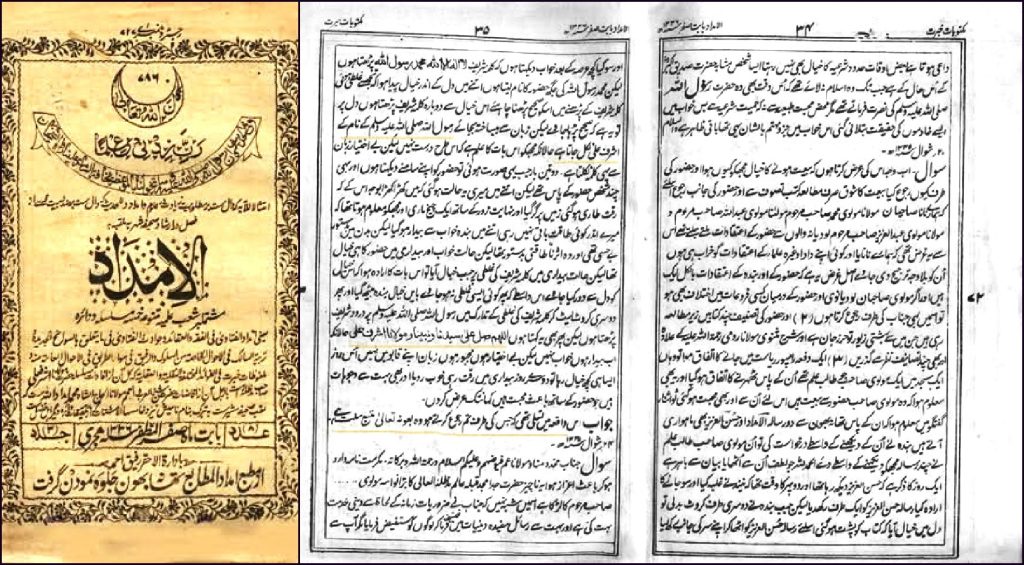 কিছু উদাহরণ দিলে বুঝতে সহজ হবে। আল ইমদাদ (الامداد), একটি সাময়িকী, সফর ১৩৩৬ হিজরী সংখ্যা নং ৮, জিলদ ৩ পৃ-৩৫। সেখানে দেওবন্দীদের মুরুব্বি মওলানা আশরাফ আলী থানভি সাহেবের জনৈক মুরিদের একটি স্বপ্নের কারগুজারি বর্ণিত হয়েছে। মুরিদ তো মুরিদই। কিন্তু এটা কোন টাইপের মুরিদ সেটাই বুঝলাম না। মুরিদ নাকি একবার তার পীর সাহেবকে স্বপ্নে দেখলেন। বহুত লম্বা কেচ্ছা। এত সময় নাই রে ভাই, শর্টকাট বলছি। স্বপ্নে পীর সাহেবের দর্শন পেলেন। মুখ দিয়ে কলেমা জারি হল, ‘লা ইলাহা ইল্লাল্লাহু আশরাফ আলী রাসূলুল্লাহ।‘ নাউযুবিল্লাহ। মুরিদ নিজেই ঘটনা বর্ণনা দিচ্ছেন আর বলছেন, আমি নিজেও বুঝতেছি যে, এটা ভুল করছি কিন্তু জবান আমার নিয়ন্ত্রণে ছিলনা। তাই খুবই ভীতসন্ত্রস্ত হলাম আর কান্নাকাটি করলাম। ঘটনা একটু লম্বা। আমি সারকথা বললাম। এতে বেরলবি ভাইদের ঈমানি দণ্ড দাঁড়িয়ে গেল। কারণ এই সুযোগ বারবার আসেনা। দেওবন্দীদের পায়জামা আজই খুইল্লা ফালাইতে হইবে। দেওবন্দীরা আশরাফ আলীর নামে কলেমা বানাইয়া ফেললো! হায় হায়, কাফের কাফের!!